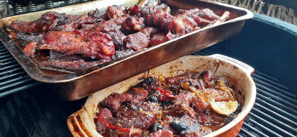 Smoke with a chunk of apple wood at slow 140c / 275f for 2 hours till get a good crust on them, add to dish and wrap in tin foil and cook for 1 hour more until tender.