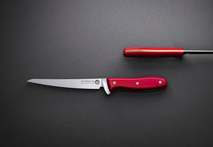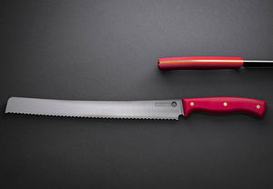 Savernake BBQ knife with red handle slicing grilled brisket on cutting board.